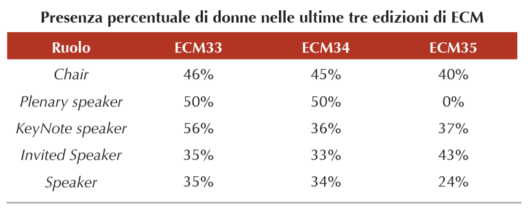 Non sempre il percorso è semplice e lineare. Nel caso di ECM35 per esempio, nonostante gli sforzi degli organizzatori scientifici, è risultato complessivamente più difficile reperire relatori e relatrici rispetto alle conferenze precedenti, e i dati percentuali risentono anche di questo aspetto. Il cammino nella lotta ai pregiudizi, consci e inconsci, che ancora persistono nel nostro bagaglio culturale, continua.