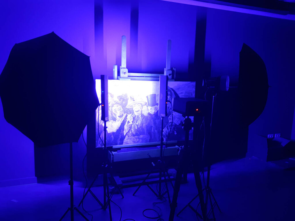 Strumentazione di imaging iperspettrale nel visibile della piattaforma MOLAB/E-RIHS durante le analisi sul dipinto L’Intrigo (1890, Museo Reale di Belle Arti di Anversa, KMSKA) di James Ensor (crediti fotografici: CNR-SCITEC, Università degli Studi di Perugia, MOLAB/E-RIHS).